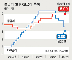 콜금리를 둘러싼 한국은행의 고민이 깊어지고 있다. 미국 중앙은행이 30일(현지시간) 정책금리를 연 3.00%로 낮추면서 콜금리(5.00%)와의 격차가 2%포인트로 벌어졌고, 이에 따라 환율 상승의 우려가 높아지면서 시장에서 콜금리 인하 요구가 거세지고 있기 때문이다. 미국 경기침체에 따른 국제경기 하락 가능성도 금리 인하에 힘을 실어주고 있다.