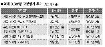 처음으로 3.3㎡당 최고 분양가가 4500만원을 돌파하면서 분양시장에 후폭풍도 적지 않을 전망이다. 그동안 분양가의 심리적 마지노선은 3.3㎡ 4000만원대였다.
