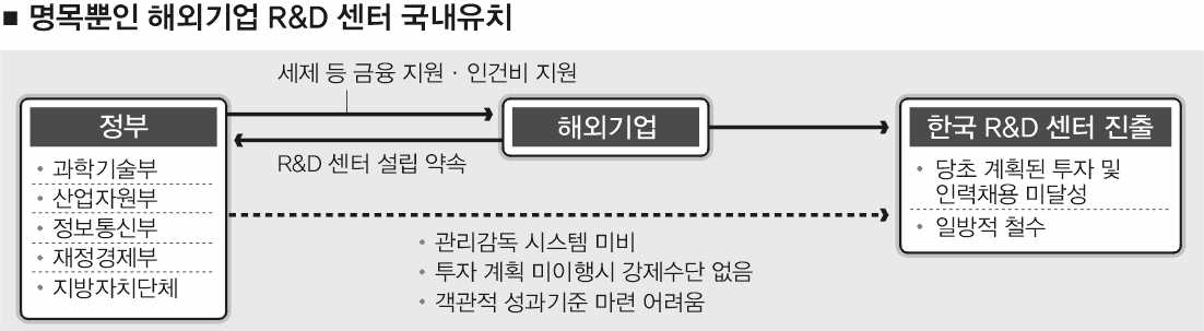 여기에는 정부와 지자체들의 ‘묻지마식’ 투자유치와 사후관리 소홀이 한몫하고 있다. 한 외국기업 관계자는 “한때 한국정부가 실적을 높이기 위해 R&D센터 유치에 열을 올리더니 차차 유치기업이 늘어나고 관련부처 장관이 바뀌면서 언제부턴가 별로 신경을 안쓰고 있다.”고 말했다.