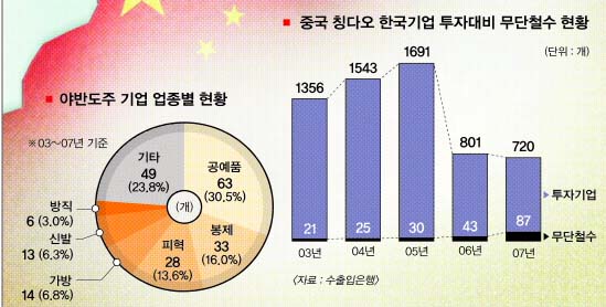 12일 수출입은행이 최근 펴낸 ‘칭다오지역 투자기업 무단철수 현황’ 보고서에 따르면 2000년부터 지난해까지 모두 8344개의 한국 기업이 칭다오시에 투자했고, 이 가운데 2.5%인 206개 기업이 무단 철수했다. 기업의 야반도주가 시작된 것은 지난 2003년 이후. 그해 21개 업체를 시작으로 매년 가파르게 증가, 지난해에는 무려 87개사가 중국을 떠났다.