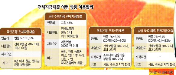 가장 대표적인 상품은 우리은행 ‘우리V전세론’과 농협중앙회의 ‘NH아파트 전세자금 대출’ 등이다. 금리는 각각 CD금리+2.3∼3.0%(25일 기준 7.5∼8.2%),CD금리+2.4∼3.2%(7.6∼8.4%)가 적용된다.