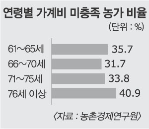 보고서에 따르면 61세 이상 고령 농업인의 연 평균 농가소득은 2465만 5000원이었다. 이는 농가 전체의 연 평균 소득 3230만 3000원의 76.4% 수준에 불과한 수치다. 특히 61세 이상 고령 농가의 34.8%는 농가 소득으로 가계비를 충당하지 못하는 것으로 조사됐다. 경영주 연령대별로 보면 61∼65세 농가에서는 35.7%,66∼70세 농가 31.7%,71∼75세 농가 33.8%,76세 이상 농가 40.9%가 소득으로 생계비를 대지 못했다. 특히 61∼65세 농가 가운데 연 소득이 2000만원 이하인 경우 절 반 이상이 가계비 지출에 미달하는 소득을 얻고 있었다.76세 이상 중 연 소득 1000만원 이하의 경우 60% 이상이 소득이 가계비를 따라가지 못했다.