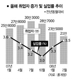 실업률은 3.5%로 3개월째 오름세를 이어갔다. 지난해보다는 0.2%포인트 감소했다. 실업자 수는 81만 9000명으로 지난해 9월 이후 5개월 연속 증가했다.15∼29세의 청년층 실업률은 7.3%로 1년 전보다 0.5%포인트 줄었으나 1월보다는 0.2%포인트 높아졌다.