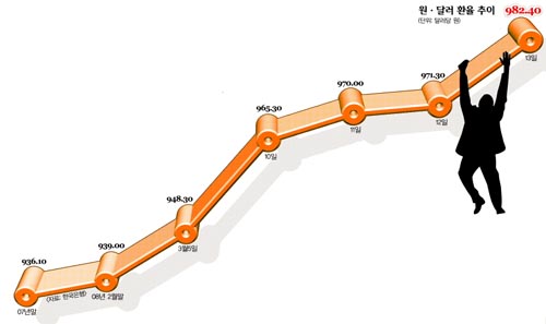한국은행에 따르면 원·달러 환율은 지난해 말 달러당 936.10원에서 13일 982.40원으로 70여일 만에 원화 가치가 4.71% 하락했다.