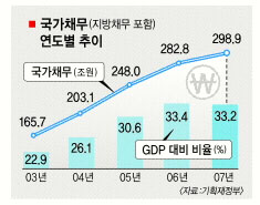 참여정부 출범 이후의 중앙정부 채무는 2003년 158조 8000억원에서 지난해 289조 1000억원으로 5년간 130조 2000억원(82.0%) 증가했다. 이는 외평채를 대신한 외평기금 재원 80조원 정도와 과거 공적자금의 국채전환분 52조 7000억원이 국채로 전환됐기 때문. 재정부 관계자는 “다른 명목으로 쓰이던 자금의 항목이 바뀌었을 뿐 실제로 국가 빚이 늘었다고 보기 어렵다.”고 설명했다.