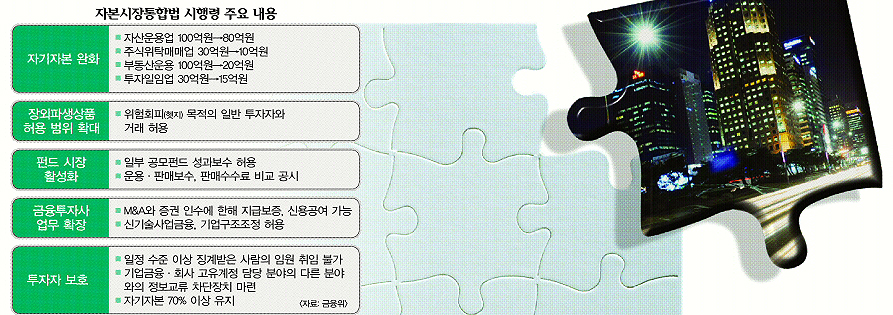 내년부터 금융투자사(현 증권사)는 인수합병(M&A)이나 기업공개(IPO) 등의 업무에도 자금을 지원할 수 있다. 자영업자 등 일반투자자도 위험 회피 목적으로 금융투자사와의 장외파생상품 거래가 가능하다. 주식위탁매매, 펀드판매 등 특정 업무에만 주력하는 회사도 대거 생긴다. 금융위원회는 6일 이같은 내용의 자본시장통합법(자통법) 시행령을 입법예고했다고 밝혔다. 자통법은 시행령과 함께 내년 2월부터 본격 시행에 들어간다.