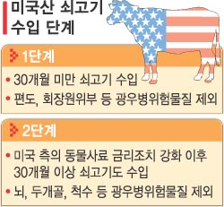한·미 양측은 1단계로 30개월 미만의 소에서 생산된 갈비 등 뼈가 붙은 쇠고기 수입을 전격 허용하고 2단계로 미국이 OIE가 권고한 ‘강화된 사료조치 방안’을 공포하면 연령제한을 완전히 없애 30개월 이상의 쇠고기도 수입을 허용키로 했다.