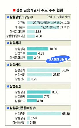 삼성의 금융계열사는 삼성생명, 삼성화재, 삼성카드, 삼성증권, 삼성투신운용 등이며, 삼성생명은 상장사인 삼성화재·카드·증권의 대주주다. 반면 삼성카드는 삼성 지배구조의 핵인 에버랜드 지분 25.64%를 소유,1대주주다.