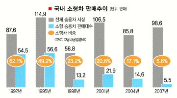 90년대 초까지만 해도 국내 자동차 시장의 3분의2 이상은 소형차들의 차지였다. 내수판매 50%의 벽이 깨진 것은 95년이었다. 전체 시장 114만 9409대의 49.2%인 56만 5943대가 팔리면서 처음으로 40%대로 내려앉았다.