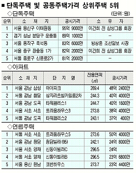 이건희 전 회장의 또 다른 주택인 중구 장충동1가 주택은 82억 2000만원으로 4위에 올랐다.