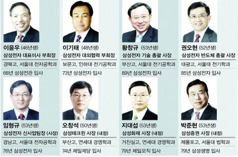 ‘황의 법칙’으로 유명한 황창규 사장은 승진 없이 기술 총괄로 옮겨갔다. 이 때문에 좌천으로 보는 시각도 있다. 하지만 여전히 최지성 정보통신 총괄 사장과 더불어 ‘포스트 윤’의 유력 후보자로 꼽힌다. 이상완 LCD 총괄 사장과 박종우 디지털미디어 총괄 사장, 새 별로 급부상한 권오현 반도체 총괄 사장의 도전도 만만찮다.