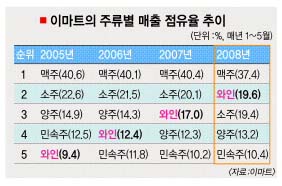 이마트에서 판매된 주류 매출 비중을 보면 와인은 2005년에는 9.4%였으나 올해(1∼5월)에는 19.6%로 껑충 뛰었다. 맥주(37.4%)의 절반을 웃도는 수준으로 성장했다. 와인매출 비중이 높아지는 추세가 이어지면 10년 내에 1위를 할 수 있다는 성급한 분석도 나온다. 이마트에 따르면 국내 와인시장은 지난해에는 4500억원으로 추정된다.