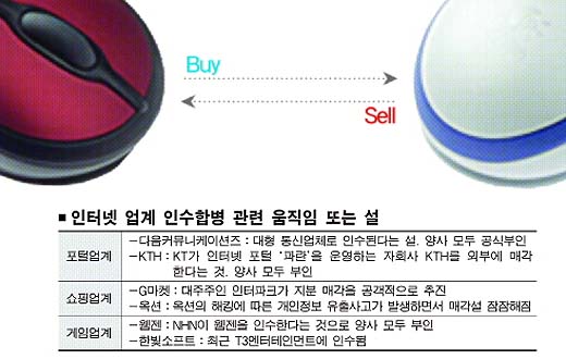 인터넷 업계가 포털·쇼핑·게임 등 다양한 사업영역에서 인수합병(M&A) 논의에 휩싸여 있다.M&A의 주체나 대상들이 해당업체의 의사에 상관없이 거론되고 있다.M&A 짝짓기를 둘러싸고 섣부른 억측도 난무한다. 분명한 것은 사업구조나 재무구조상 극한상황에 내몰린 기업도 늘었고, 반대로 다른 기업을 사들이는 방식으로 경쟁력의 강화를 꾀하려는 기업들도 늘었다는 것이다. 이런 측면에서 인터넷 업계의 ‘M&A 빅뱅’은 시기의 문제일 뿐 곧 현실화할 기정사실로 받아들이는 사람들이 적지 다.