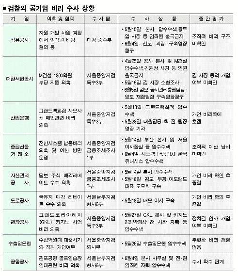 또 금융조세조사2부의 자산관리공사 리베이트 수수 의혹, 서울남부지검 형사6부의 도로공사 국유지 매각 비리 의혹 등도 실무자 한두명을 처벌하는 데 그치고 말았다. 게다가 서울중앙지검 금융조세조사1부의 증권선물거래소 수사 역시 요란했던 수사 착수에 비해선 그다지 시원스러운 성과를 내지 못하고 있다. 검찰 수사에 몸을 사렸던 공기업들 사이에선 “거악 척결을 위해 갈아온 칼로 허공만 가르는 격”이라는 비판도 적지 않다.