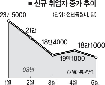 통계청이 11일 발표한 ‘5월 고용동향’에 따르면 지난달 취업자 수는 2393만 9000명으로 지난해 같은 달에 비해 18만 1000명 증가하는 데 그쳤다. 이 증가폭은 2005년 2월 8만명 이후 가장 낮은 것이다. 정부의 올해 일자리 창출 목표인 28만명에도 크게 못 미치는 규모다.