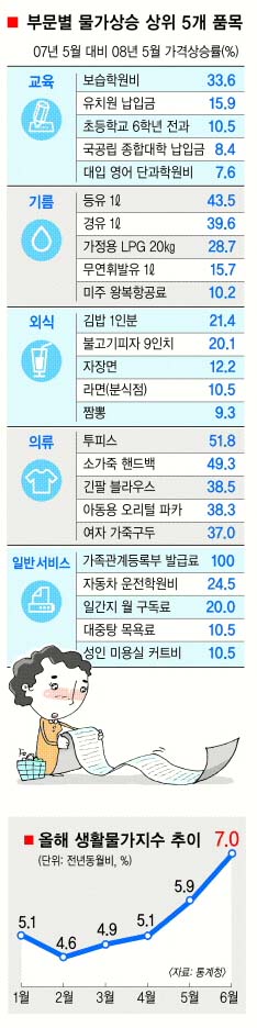 정부의 물가지수 작성에 기초가 되는 461개 상품·서비스 품목 중 지난 1년간 20% 이상 가격이 뛴 품목이 49개에 이르는 것으로 나타났다. 밀가루, 금반지 등 8개 품목은 50% 이상 급등했다.10% 이상 오른 품목도 97개나 됐다. 서민생활과 직결되는 식품·의류·연료 등 관련제품을 중심으로 연쇄적인 가격상승이 일어났다. 하지만 공산품이 아닌, 서비스요금의 인상은 아직 본격화하지 않아 전기료·교통비 등 공공요금과 함께 하반기 물가불안을 더욱 가중시키는 요인으로 작용할 전망이다.