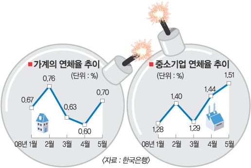 이에 따라 ‘0%대 연체율’을 지키고 있는 가계대출이 부실화될 가능성도 제기된다.5월 가계의 연체율은 0.70%로 4월의 0.60%보다 0.10%포인트 상승했다. 금융연구원 서병호 연구위원은 “연체율 수준은 안정적이지만 추이가 상승하고 있다는 것이 문제”라면서 “6,7월 소비자 물가가 계속 오른다면 가계대출 부실이 우려된다.”고 말했다.