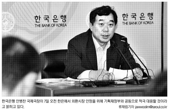 재정부 최종구 국제금융국장과 한국은행 안병찬 국장은 이날 각각 기자회견을 열어 ‘외환시장 동향에 대한 견해’를 발표한 뒤 “외환시장의 불균형이 과도하다고 판단될 경우 필요한 조치를 강력히 취할 것”이라고 밝혔다. 최 국장은 “정부는 사실 그동안 환율 안정을 위해 (달러) 매도 개입을 해왔다.”면서 “앞으로도 필요하다면 외환보유고를 동원할 생각”이라고 말했다.