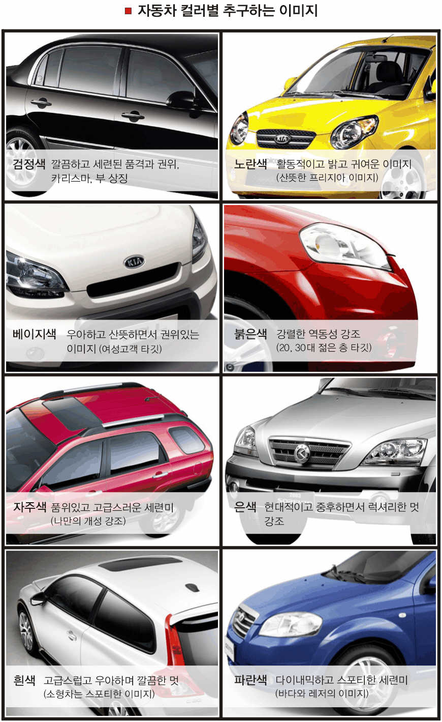 현대자동차는 올초 프리미엄 세단 ‘제네시스’를 출시하면서 차체 색상 선정에 어느 때보다 많은 공을 들였다. 벤츠,BMW 등 독일 명차들과의 경쟁을 선언한 터에 컬러 또한 ‘쏘나타’,‘그랜저’ 등 기존 차종과는 다른 고급화가 필요했다. 무수한 영상제작과 시행착오, 전문가 회의를 거쳐 ‘하이퍼 메탈릭’,‘팬텀 블랙’,‘스털링 실버’,‘화이트 프로스트’,‘스틸 블루’,‘루나 베이지’,‘로열 블루’,‘벨벳 레드’ 등 8종의 프리미엄 컬러 라인업이 확정됐다.자동차 디자인이 첨단 공학·미학에 힘입어 빠르게 진화하면서 컬러 또한 변신을 거듭하고 있다. 전에 볼 수 없던 파격적인 색상이 등장하는가 하면 은색·회색·흰색·검정색 등 무채색 계열 컬러들도 도료입자의 성분조정 등을 통해 다양하게 분화되면서 차의 이미지를 바꾸고 있다.