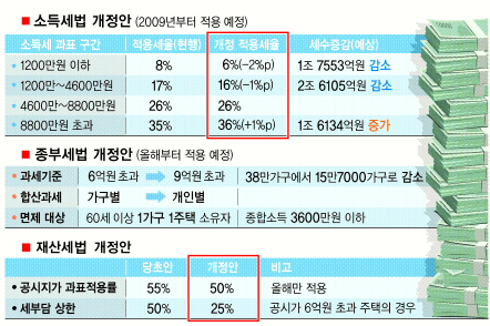 저소득층에 대한 소득세 부담이 경감되고, 종합부동산세에 대한 과표기준도 6억원에서 9억원으로 상향 조정돼 고가주택 보유자들의 세부담이 줄어들 것으로 보인다.