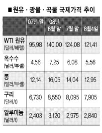 이런 가운데 그동안 물가급등을 유발해 온 원유, 광물, 곡물 등의 국제시세는 지난달 중순 이후 완연한 하락세를 보이고 있다.