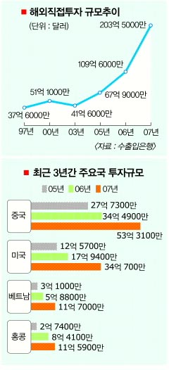 5일 한국은행이 내놓은 ‘우리나라 기업의 투자형태 변화’에 따르면 우리 기업들의 해외직접투자는 2005년 이후 급격히 늘어나 2007년에 203억 5000만달러로 전년보다 85.5%가 급등한 것으로 나타났다. 또한 2007년에 설립된 신규법인수도 5633개로 1997년에 비해 4배 이상 늘었다.2007년 중 해외직접투자액은 우리나라 전체기업 투자자산 증가액과 유형자산증가액의 33.6%와 52.4%에 해당하는 것이다.