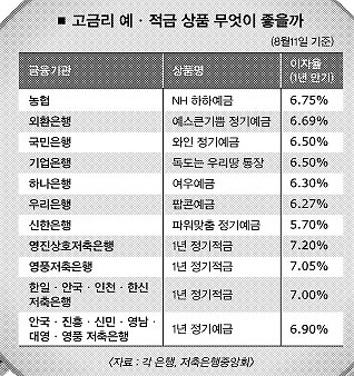 정기예금 상품으로는 안국과 진흥, 신민, 영남, 대영, 영풍 등의 저축은행이 1년 기준 6.9%의 연 이자를 내걸고 있다. 다만 저축은행 상품은 5000만원 이상의 큰 금액은 예금자보호법에 따라 보호받을 수 없다는 점을 감안해야 한다. 한 저축은행 관계자는 “시중은행보다 위험도가 높을 수 있는 만큼, 해당 저축은행의 건전성을 꼼꼼히 체크한 뒤 거래를 하는 것이 현명하다.”고 말했다.