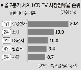 금액 기준 점유율은 삼성(23.9%), 소니(17%),LG전자(9.6%), 샤프(9.2%), 필립스(8.8%) 순서다.