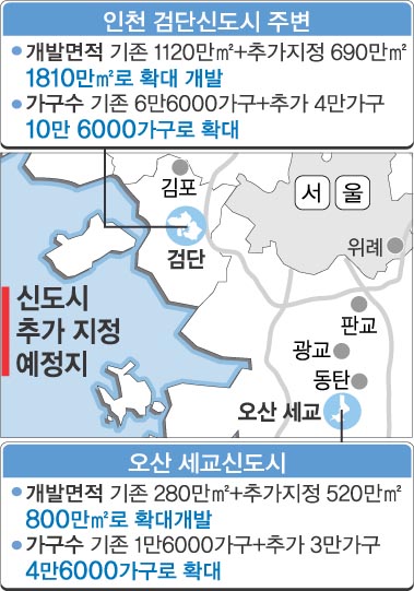 국토해양부는 20일 이미 발표된 인천 검단신도시(1120만㎡)를 검단2지구(690만㎡)와 합쳐 1810만㎡로 확대키로 했다. 또 오산 세교2택지지구(280만㎡)와 세교3택지지구(520만㎡)는 한 덩어리로 묶어 800만㎡의 신도시로 개발키로 했다.