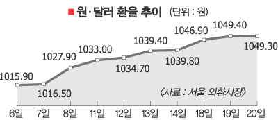 20일 서울 외환시장에서 달러화에 대한 원화 환율은 전날보다 0.1원 내린 달러당 1049.30원에 거래를 마쳤다. 이날 환율은 전날 종가보다 2.6원 오른 1052.00원으로 개장한 뒤,1053원까지 오르며 올들어 장중 고점인 5월 21일의 1057.30원 돌파를 시도했다.