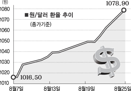 지난 7월25일 1009.20원과 비교하면 한달 사이에 무려 69.70원이 오른 셈이다. 올라가는 속도도 아주 가파르다.