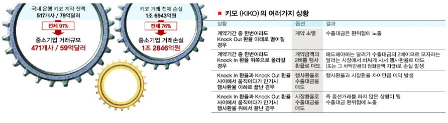 중소기업중앙회가 키코 가입 중소기업 102개사를 대상으로 부채상환계수를 이용해 부도위험을 측정한 결과 환율이 1000원일 때 부도위험에 놓인 기업의 비율이 59.8%이지만 1100원이면 62.7%,1200원 때는 68.6%로 올랐다. 이미 키코에 가입한 70%의 중소기업이 키코 손실로 문을 닫을 위험에 처했다는 뜻이다.
