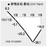 지식경제부가 1일 발표한 ‘9월 수출입동향’에 따르면 무역수지(수출액-수입액)는 18억 9000만달러의 적자가 났다. 수출액이 지난해 같은 달보다 28.7% 늘어난 377억 5000만달러를 기록했으나 수입액(396억 5000만달러)이 훨씬 더 늘면서(45.8%) 400억달러에 육박했다.