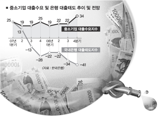6일 한국은행이 국내 16개 은행의 여신총괄담당 책임자들을 대상으로 면담 조사해 발표한 ‘금융기관 대출행태 서베이 결과’에 따르면 올해 4분기 중소기업에 대한 대출태도지수는 -41로 이 통계를 편제한 1999년 이래 사상최고치로 나타났다. 대출태도 지수가 플러스이면 ‘대출 완화’를, 마이너스면 ‘대출 억제’를 하려는 은행이 많다는 뜻이다.