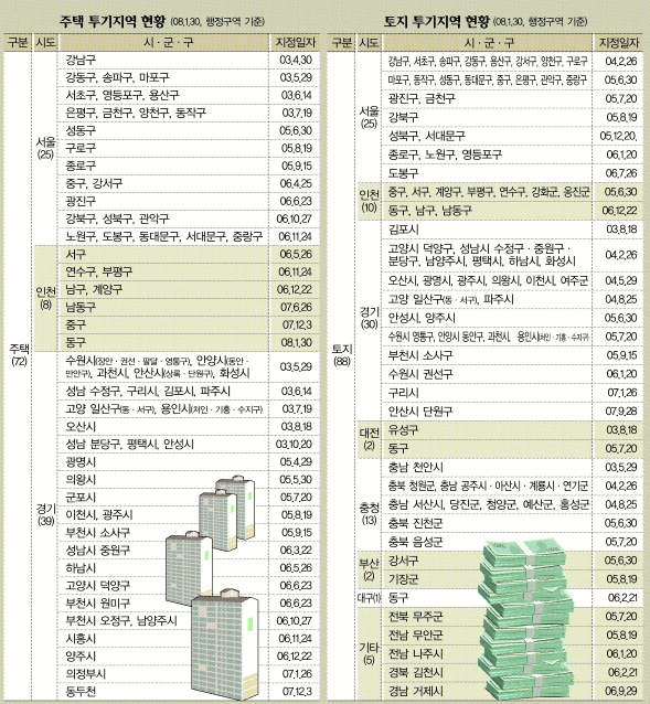 주택투기지역은 2003년 4월 서울 강남구를 지정한 뒤 강동·송파·마포·서초지역 등으로 확대됐다. 토지투기지역 지정은 2003년 8월 유성·김포지역 등을 시작으로 확대됐다.