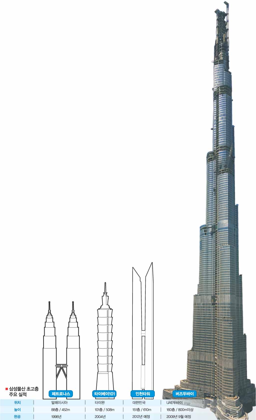삼성건설은 초고층 실적에서 국내 1위, 세계 6위이지만 ‘버즈 두바이(800 m 이상)’,‘타이베이금융센터(TFC 101·508m),‘쿠알라룸푸르 페트로나스 트윈타워(452m) ’ 등 세계 3대 초고층빌딩을 시공했다는 점에서 발주처나 경쟁기업들에 특별한 대접을 받는다.