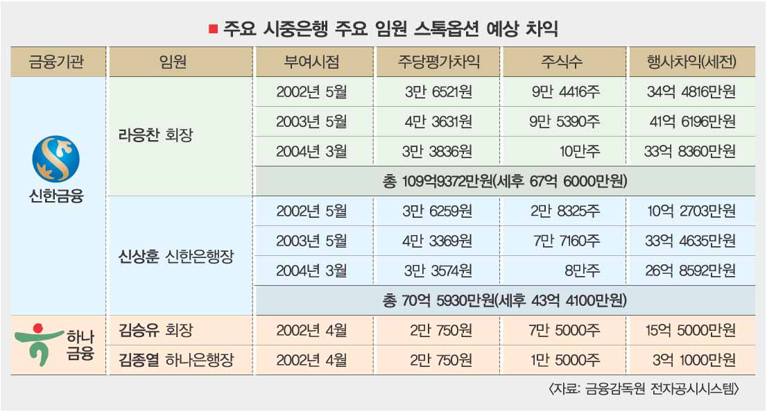 23일 금융감독원과 시중은행 등에 따르면 라응찬 신한금융회장은 지난 2002년부터 2004년까지 부여받은 스톡옵션 29만여주를 지난해 3월23일 모두 행사했다. 당시 신한금융 주가 5만 5431원을 기준으로 세전 109억 9000만원, 세후 67억 6000만원의 수익을 거뒀다. 신상훈 신한은행장도 작년 4월19일 15만 5000여주에 대한 스톡옵션을 행사하면서 70억 5900만원, 세금 납부 뒤 43억 4100만원의 차익을 올렸다.