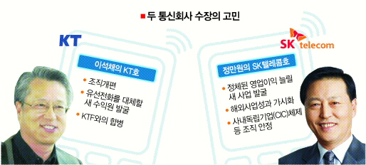 통신업계가 이석채 KT 사장후보와 정만원 SK텔레콤 신임 사장 구도에 바짝 긴장하고 있다.우선은 내부 조직 다지기에 치중하겠지만 곧바로 유선 강자인 KT와 무선 강자인 SK텔레콤의 한판 대결로 이어질 전망이다.
