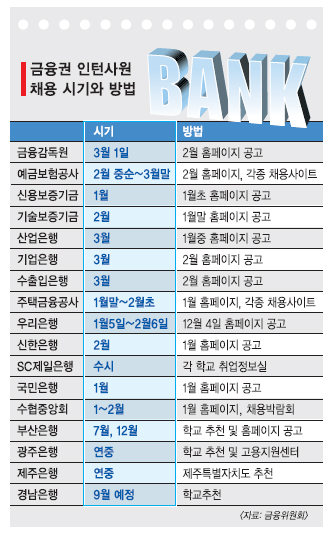 금융위안에 따르면 금융감독원·산업은행·수출입은행 등 금융공기업은 정원의 4.1%에 이르는 700명 정도를 인턴으로 채용한다.채용시기도 1~3월에 집중되어 있다.민간 금융회사가 인턴으로 채용할 인력은 정원의 2.9% 수준이다.구체적으로 은행 3990명,보험사 910명,증권사 740명,저축은행을 포함한 나머지 제2금융권 300명 등이다.