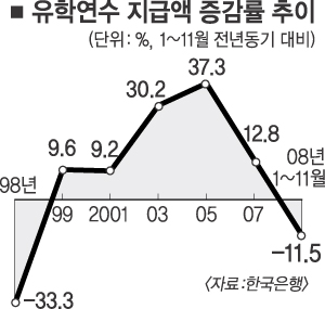우리나라가 1년간 해외에 지불한 유학연수비가 전년보다 감소한 것은 외환위기 때인 1998년(-33.3%)이 마지막이었다. 지난해 여행수지(유학연수+일반여행)가 개선된 결정적 배경이다. 일반여행 지급액도 지난해 11월 4억 7390만달러로 전년 같은 달(14억 3980만달러)에 비해 67.1%나 줄었다. 이 덕에 여행수지는 지난해 10월, 11월 두 달 연속 흑자를 기록했다.