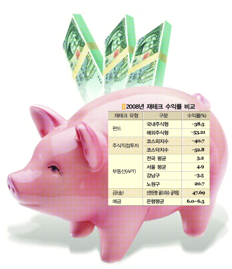 게으른 아빠가 부자 아빠가 된 한 해였다. 재테크를 통해 뭔가 해보려는 사람일수록 더욱 손해를 봤다는 이야기다. 그만큼 지난해 재테크 기상도는 한마디로 먹구름이었다. 하지만 되뇌기 싫은 쓰린 기억일수록 내일을 준비하려면 되짚어봐야 하는 법. 2008년 재테크 성적표를 돌아봤다.