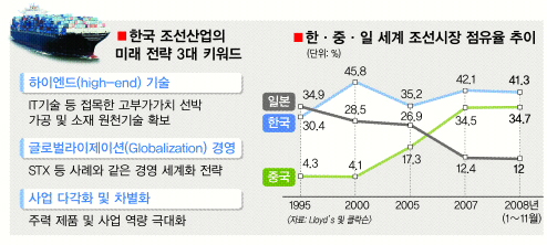 한국 조선산업이 오히려 글로벌 경기 불황을 발판 삼아 중국의 추격을 따돌리고 세계 1등의 입지를 확고히 해야 한다는 지적이다. 과감한 투자와 함께 고부가가치 선박 기술 경쟁력을 보다 높이는 지혜가 요구된다.20일 업계에 따르면 세계 조선 산업은 기술 경쟁력을 보유한 한국 대형업체들과 정부의 전폭적 지원을 받는 중국 업체들간의 양강 체제다. 일본은 최근 들어 뒤처지고 있다.
