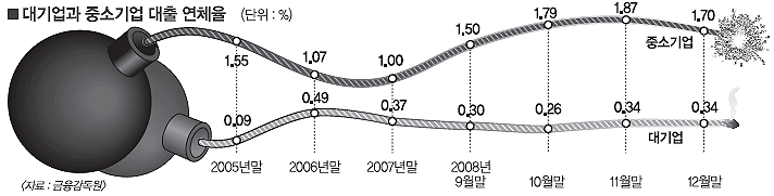 대기업의 연체율은 2008년말 0.34%로, 0.03%포인트 떨어졌다. 반면 중소기업의 연체율은 1.70%로 0.70%포인트 급등했다. 중소기업의 연체액도 크게 늘어 지난해 말 기준 7조 2000억원으로, 2007년 말의 3조 7000억원보다 2배 가까이 불어났다.