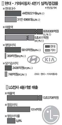 전체로 보면 ‘우등생’, 4·4분기만 놓고 보면 ‘낙제점’. 22일 지난해 4분기(10~12월) 실적을 발표한 자동차, 전자, 에너지, 상사 등 주요 기업들의 성적표다. 지난해 사상 최대의 영업이익(LG전자)을 내는 등 전체적으로는 ‘선방’했지만 4분기부터는 모든 기업이 글로벌 불황의 직격탄을 피해가지 못했다. 수출부진이 이어지면서 올 한해는 어느 때보다 부진한 성적을 낼 것으로 우려된다.