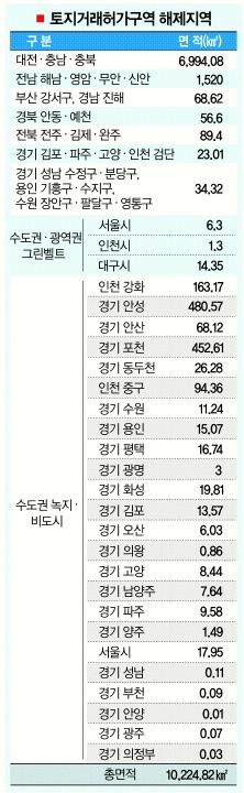 허가구역이 가장 많이 풀린 곳은 행복도시건설 지역 보상이 끝난 대전·충남·충북지역(6994.08㎢)으로 전체 해제 면적의 70%를 차지한다. 이미 착공에 들어갔거나 예전과 같은 ‘묻지마 투자’식 투기가 사라진 상태여서 허가구역을 풀더라도 땅값 상승으로 이어지지는 않을 것으로 보인다.
