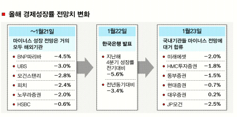 이런 흐름의 기폭제는 22일 한국은행 발표다. 지난해 4분기에 전기 대비 -5.6%, 전년동기 대비 -3.4%의 역(逆)성장을 했다는 발표가 나오자마자 23일 오전부터 마이너스 성장 전망이 국내 기관들로부터 쏟아져 나왔다. 마이너스 성장 예측을 완료해 놓고 어차피 엉망으로 나올 22일의 4분기 경제 성적표를 기다리고 있었던 듯하다.