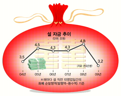 올해 설 자금도 ‘구조조정 된서리’를 맞았다. 지난해보다 2조원 가까이 줄었다. 외환위기 때 수준으로 쪼그라들었다. 월급쟁이들은 아예 없거나 얄팍해진 설 상여금 봉투를, 개인들은 눈에 띄게 팍팍해진 세뱃돈 인심을 체감할 것으로 보인다.