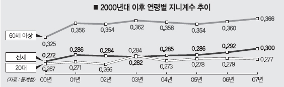 연령계층별로 보면 60세 이상 노인의 경우 지니계수 증가세가 훨씬 가파르다. 2000년 0.325에서 2007년 0.366으로 0.041포인트나 증가했다. 60대 이상 지니계수는 카드 대란이 한창이던 2003년 0.362로 뛴 뒤, 이후 2005년 0.354까지 완만하게 떨어졌다. 그러나 2006년 0.360으로 상승한 이후 계속 증가세다. 지니계수가 0.4 이상이면 소득분배 구조가 심각하다는 점을 감안했을 때 노인 빈곤은 거의 임계점에 다다른 상태다.