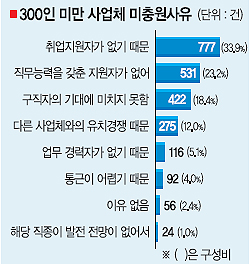 노동부가 지난 연말 300인 미만 사업체의 미충원근로자(고용주가 근로자를 구하려고 노력했지만 채용에 실패한 경우)를 집계한 결과 8만 6000여명으로 나타났다. 다시 말해 지금 당장 8만 6000명가량의 일자리가 근로자를 찾지 못해 비어있는 것이다. 5인 이상의 사업체를 대상으로 할 때는 미충원 인원은 9만 3000여명에 이른다.