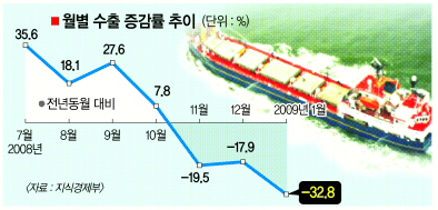 월별 수출입통계를 내기 시작한 1980년 이후 29년 만에 가장 큰 감소폭이다. 지금까지는 정보기술(IT) 거품이 꺼지며 반도체·컴퓨터 수출이 급감했던 2001년 7월(-21.2 %)의 감소폭이 가장 컸다. 수출증가율은 지난해 11월(-19.5 %), 12월(-17.9 %)에 이어 올 1월까지 3개월 연속 감소세를 보였다.